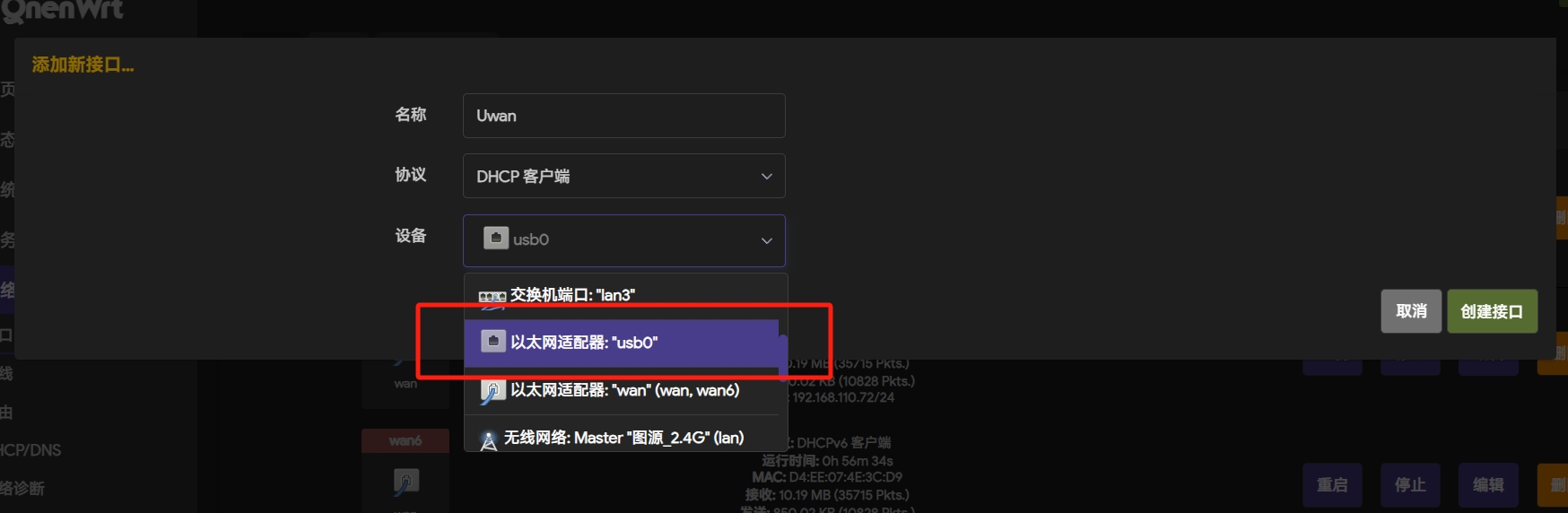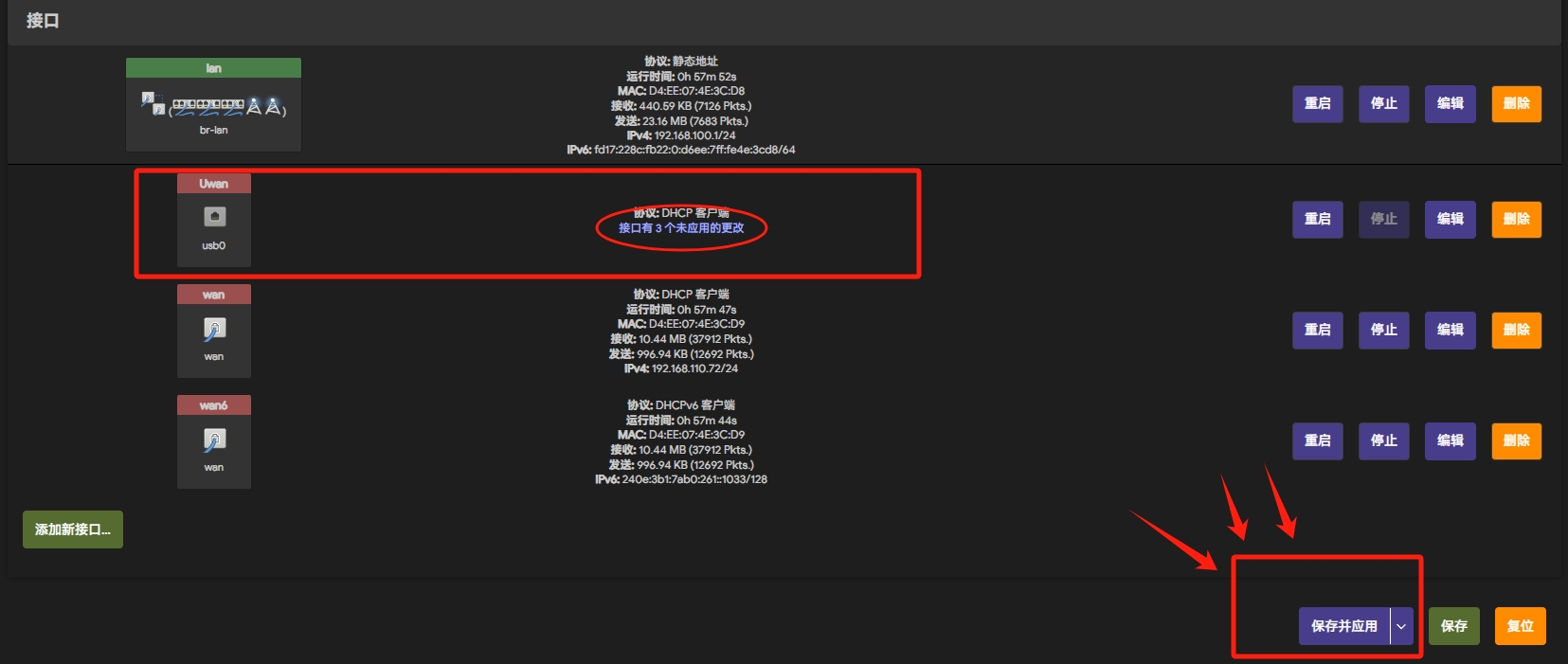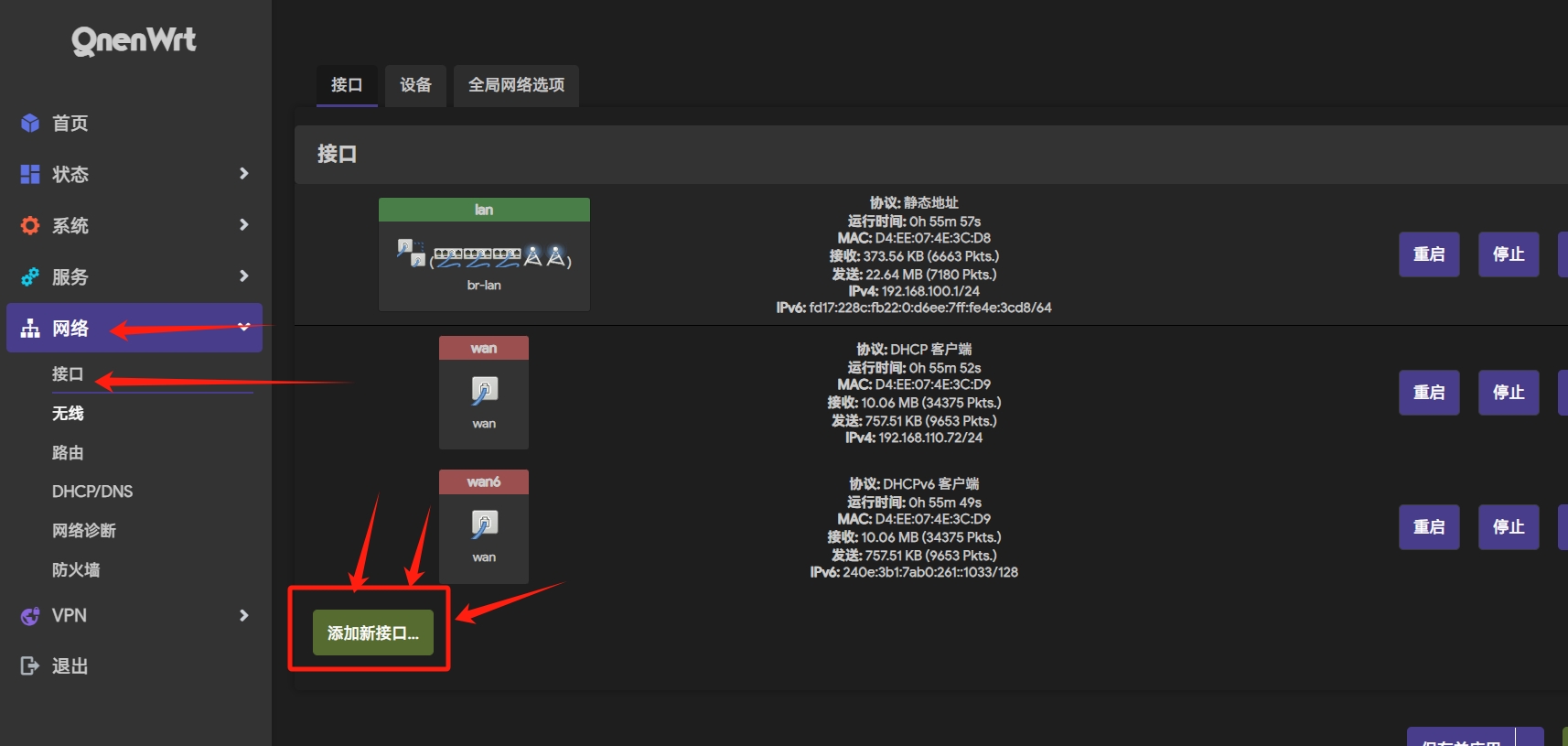然后打开“网络-接口”界面,添加新接口打开“网络-接口”界面,添加新接口