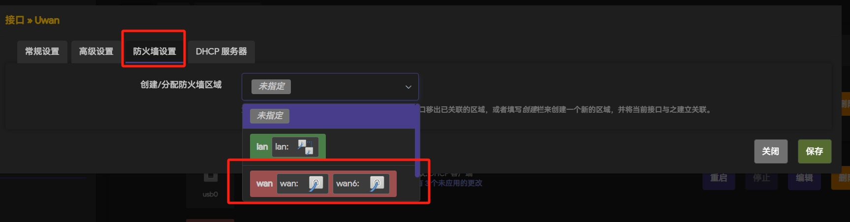 在接口设置中选择“防火墙设置”,选择“Uwan”以将新建的接口加入wan口组,保存