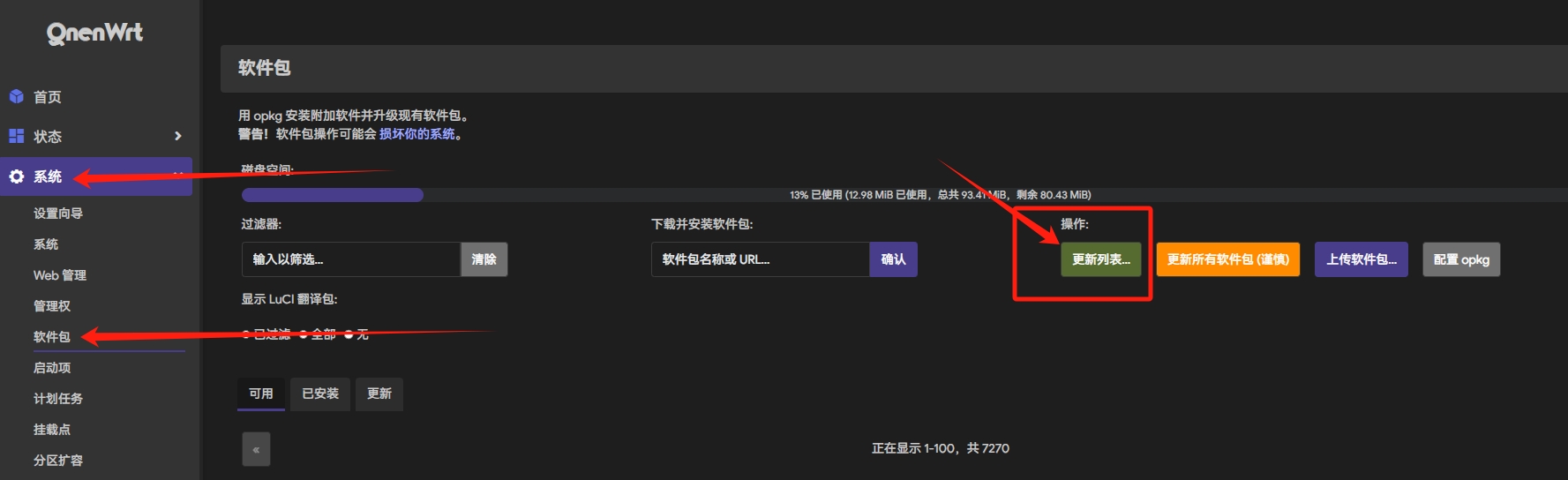 打开“系统-软件包”界面,点击“更新列表”以更新ipk插件列表