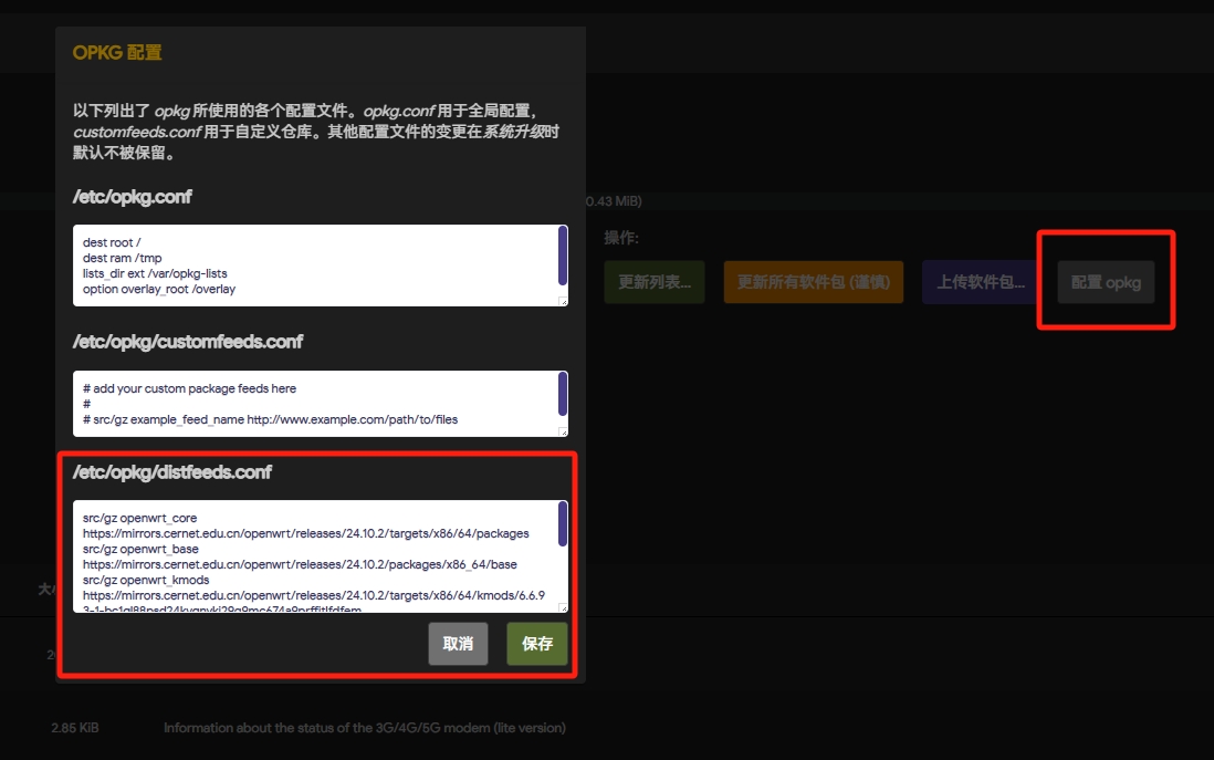 如果你使用官方版本OpenWrt,是无法更新列表,则需要更换国内软件源,点击“配置opkg”将“/etc/opkg/distfeeds.conf”栏中的