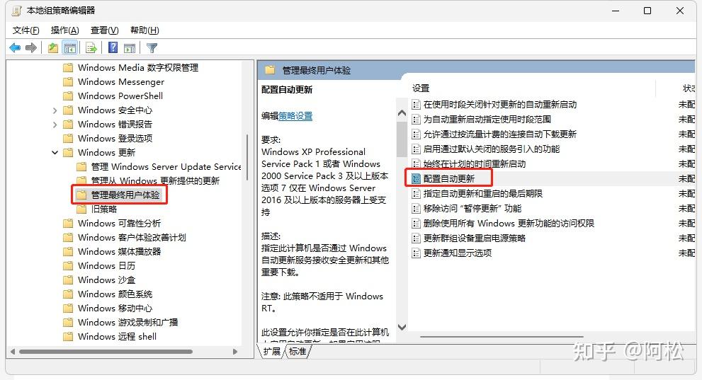 本地计算机策略>计算机配置>管理模板>Windows组件>Windows更新>管理最终用户体验2.在该文件夹下找到并双击“配置自动更新”。