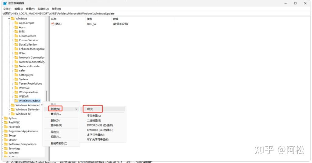 3.右键点击新建的WindowsUpdate文件夹,选择“新建”>“项”,并将新建项命名为“AU”。