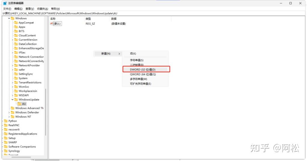 4.在新建的AU文件夹的右侧空白页面右键点击并选择“新建”>“DWORD(32位)值”,并将其命名为“NoAutoUpdate”。